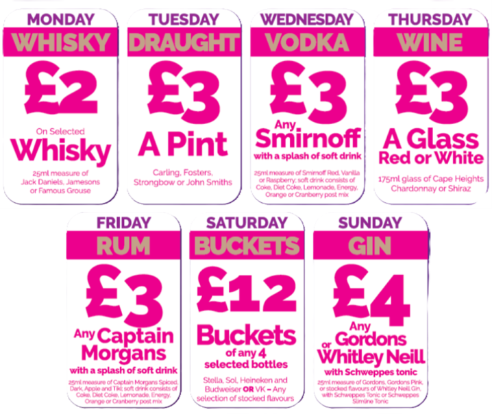 Pint of Carling, John Smiths, Strongbow and Fosters for only £4.00, from 10am-11pm.